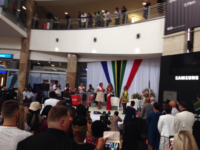 Having made it through immigration and customs, I arrived at the main entrance hall of OR Tambo International Airport. There were television camera crews and a crowd gathered. It turns out that the reigning Miss Universe, Demi-Leigh Nel-Peters, is from South Africa and on a flight arriving just after mine. I accepted a ‘Welcome Home’ sign from a very thin young woman and waited. 30 members of the Soweto Gospel Choir were on hand, as well as present and past beauty queens from South Africa. Miss Teen South Africa. Miss Petite South Africa. Little Miss South Africa. The folks in the choir were all black. The tiara-wearing beauties were overwhelmingly white and none were black.