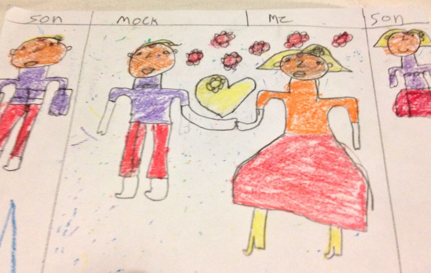 Today she gave me a picture she drew. It shows the two of us, ‘Mock’ and ‘Me,’ holding hands with a big heart between us, and our two children. It seems fitting that she is by far the biggest of the two of us.